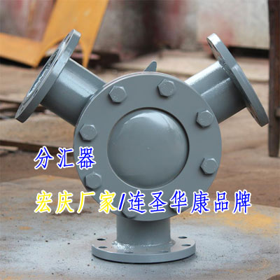 分匯器——膠球清系統(tǒng)分匯器 分匯器是一個三通閥,通過導(dǎo)向板的切換可使膠球進入需要清洗的一側(cè)凝汽器中工作。一般一臺機組需兩臺分匯器,其進口通徑為DN100,分配口為DN89,膠球投用時可通過窺視窗觀察運行情況。 發(fā)電廠凝汽器膠球自動清洗裝置系統(tǒng)組成:FH型分匯器(清潔海綿膠球切換三通管閥)。 分匯器可以將一根循環(huán)管分開成兩根獨立的管,比如在裝球器出口一根管路變到兩只噴球器的入口管路,那么分匯器可以很好的將此功能實現(xiàn);同樣當(dāng)把兩根再循環(huán)管合在一起成為一根再循環(huán)管時,比如兩個收球口的管路匯集到膠球泵的入口管路時,分匯器扮演了同樣的角色。