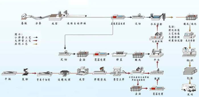 公司擁有國(guó)內(nèi)先進(jìn)制管流水線6條。從分條開卷、清洗脫脂、緄軋成型、焊接、打磨、定徑、在線固熔、渦流探傷、標(biāo)志噴碼、定尺檢驗(yàn)、氣密性試驗(yàn)、檢驗(yàn)包裝,都嚴(yán)格按照GB/T12771-2000《流體輸送用不銹鋼焊接鋼管》、ASTM A249/A249M-96a《鍋爐、過(guò)熱器、熱交換器及冷凝器用奧氏體焊接鋼管》、SA-249/SA-249M《鍋爐、過(guò)熱器、換熱器和冷凝器用焊接奧氏體鋼管子》執(zhí)行。公司專業(yè)生產(chǎn)的管徑12mm-76mm,壁厚0.2mm-3.0mm的不銹鋼氬弧焊管,廣泛用于電力、化工、機(jī)械等行業(yè);特別對(duì)電力行業(yè)的凝汽器改造用的高效不銹鋼管的生產(chǎn)、安裝有著豐富的經(jīng)驗(yàn)和能力。